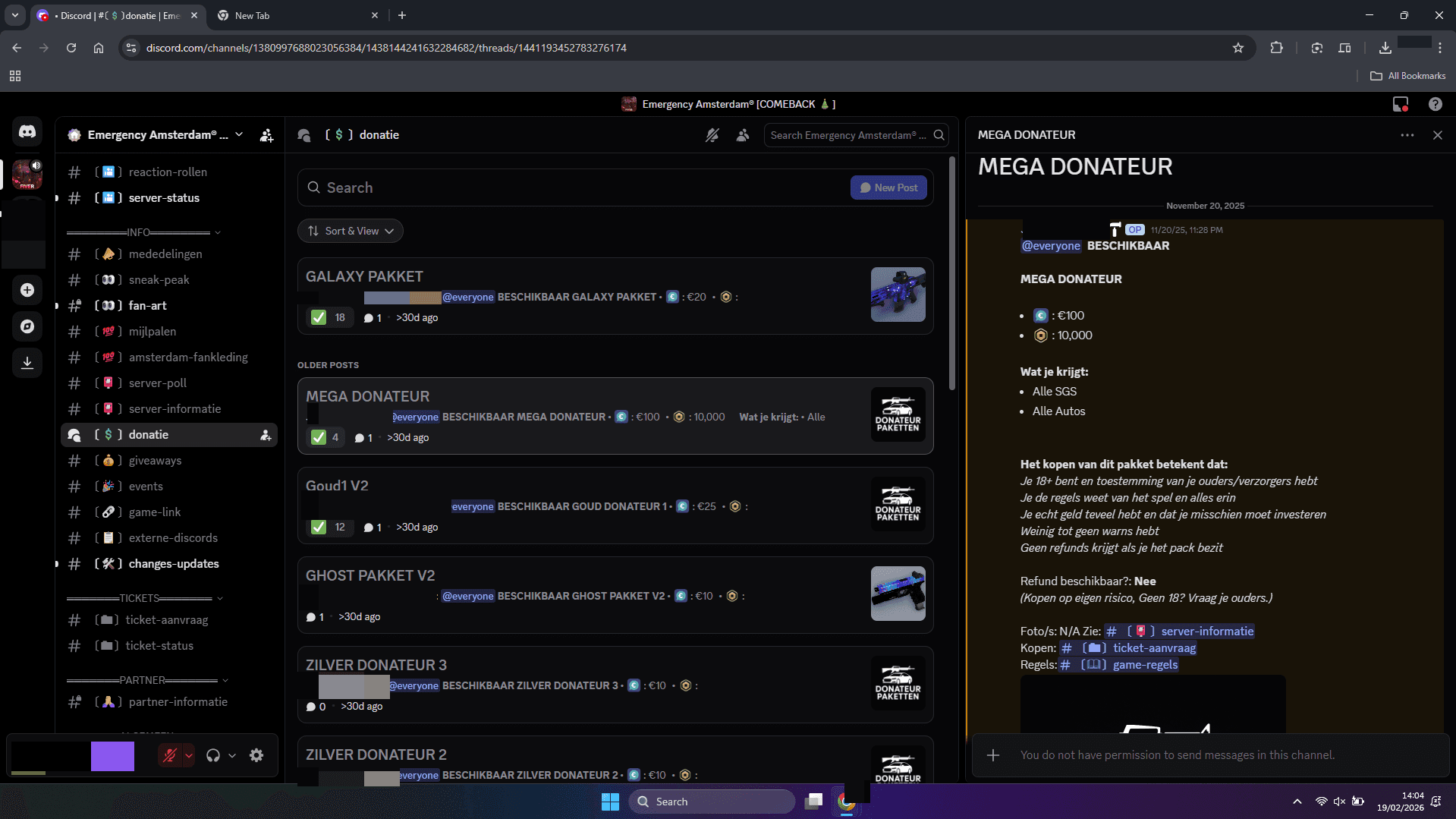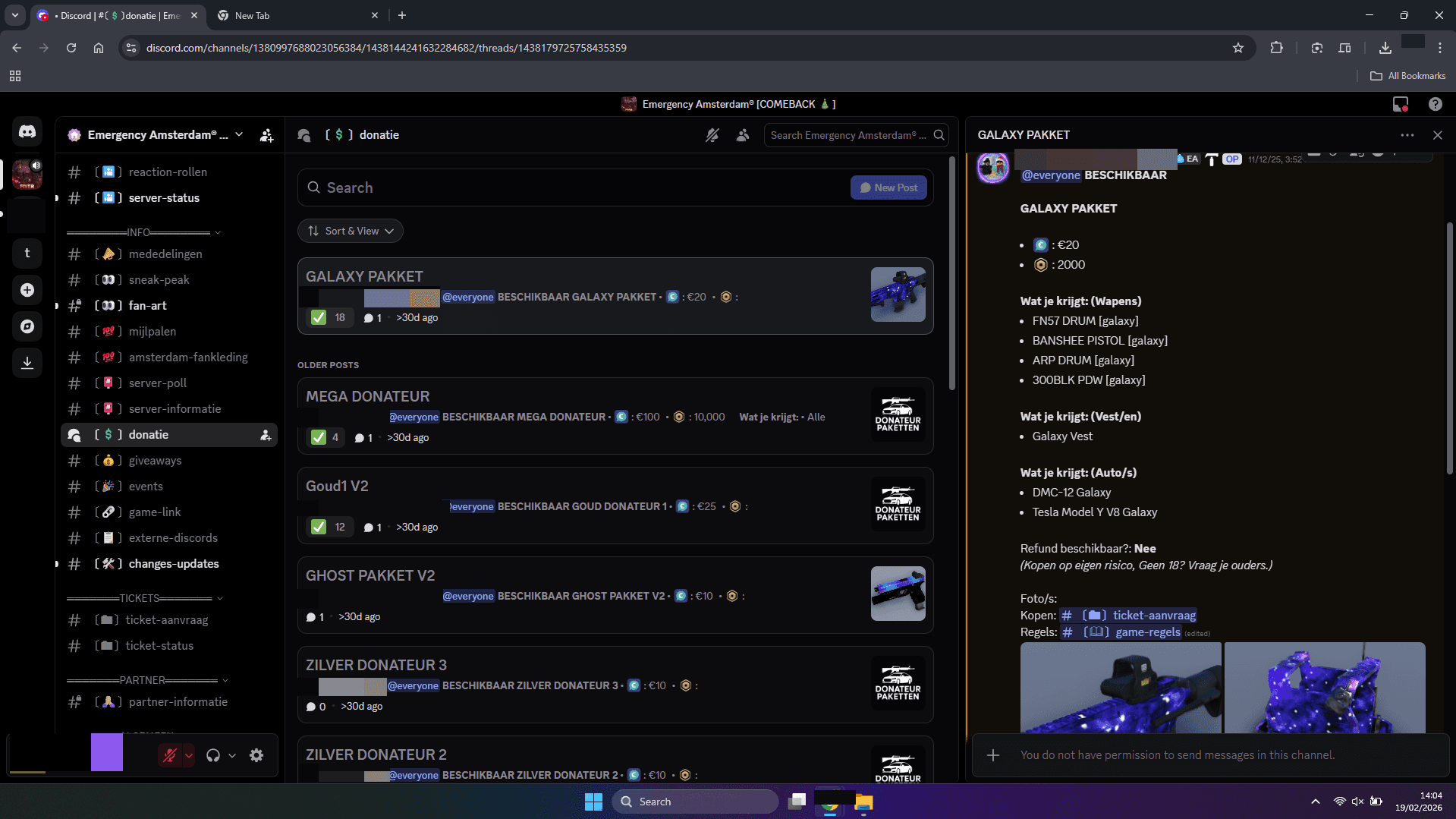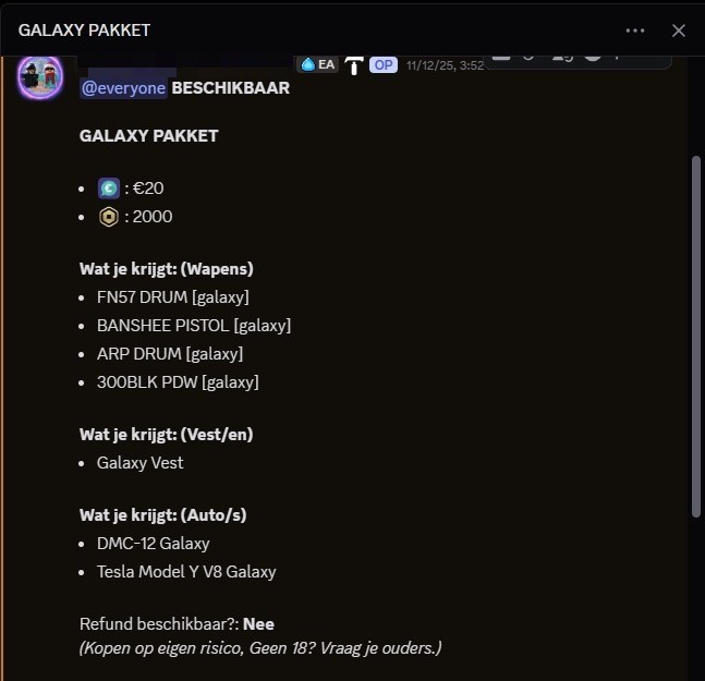 The investigation identified a structured commercial environment within the Discord community of 'Emergency Amsterdam'. Evidence shows a catalog of in-game items, ranging from basic packs to high-tier weaponry, being offered for prices up to €100.00 EUR per unit. By facilitating these transactions, the developers are directly responsible for "Platform Revenue Theft," depriving Roblox of its mandatory 30% commission.
